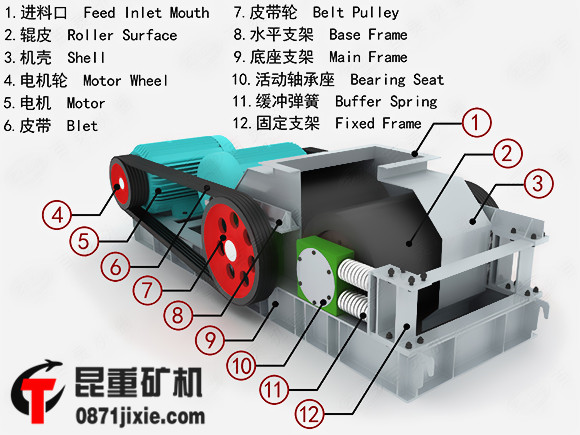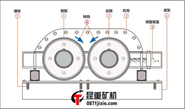 兩輥輪之間裝有楔形或墊片調節裝置,楔塊向上拉起時,楔塊將活動輥輪頂離固定輪,兩輥輪間隙變大,出料粒度變大,當楔塊向下時,活動輥輪在壓緊彈簧的作用下兩輪間隙變小,出料粒度變小。墊片裝置通過增減墊片數量或厚薄來調節出料粒度大小,增加墊片時兩輥輪間隙變大,出料粒度變大。