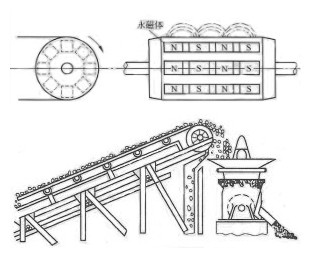 磁力滾筒又稱干磁輥,其結構簡單,可直接安裝在皮帶輸送機的頭部,也可以叫拋廢機。磁性物料隨皮帶移動到滾筒頂部時即被吸附,轉到底部時自動脫落,而非磁性物料沿水平拋物線軌跡直接落下。它可用于物料除鐵,特別是用于磁鐵礦塊礦預選,俗稱減石頭機。目前,是磁鐵礦選礦廠的主要選礦設備。