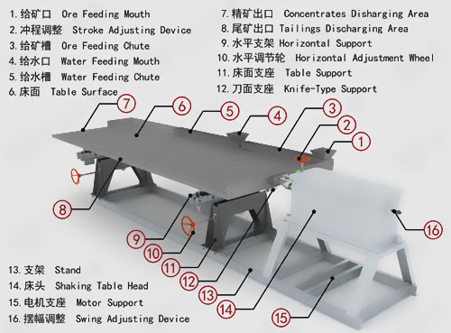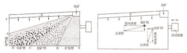 在縱向,床面的差動運動、(起初以慢速前進并逐漸加速,到速度達最大時突然后退,后退過程中速度逐漸減小,然后又前進,重復(fù)上述過程)不僅促進礦砂層松散分層、而且使重礦粒以較大速度沿縱向向前運動,使輕礦粒以較小速度向前運動。